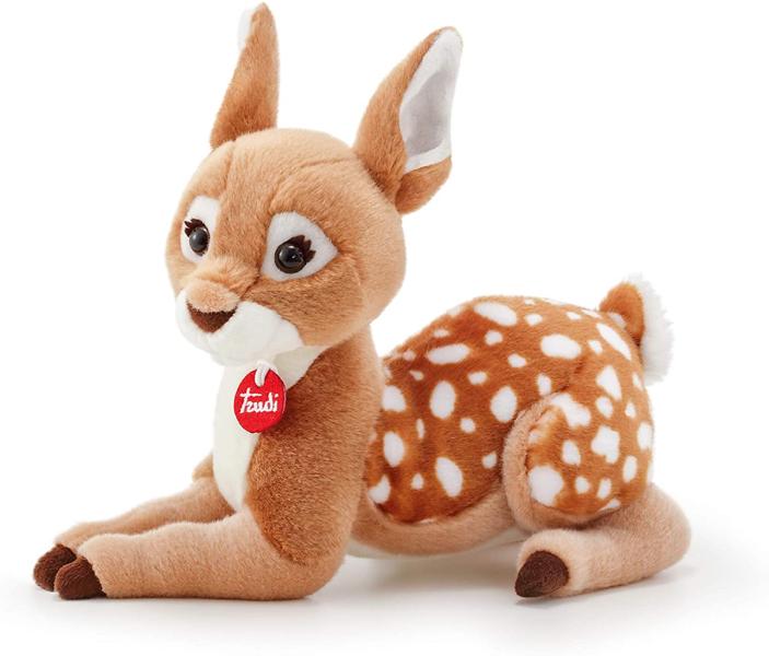 Il cerbiatto Berty conquista per la sua espressione dolcissima, ottenuta grazie alla riproduzione fedele dei suoi caratteristici occhioni e al musetto delicato. Da sempre simbolo della rinascita, è riprodotto con il suo caratteristico mantello rossiccio, decorato con le tipiche macchioline biancastre. Il cucciolo è ritratto in una posizione semisdraiata, con le zampette piegate e le orecchie all'insù. Il peluche è lavabile in lavatrice a 30°, quando la misura lo consente, in alternativa può essere lavato a mano, utilizzando una spugna e sapone neutro