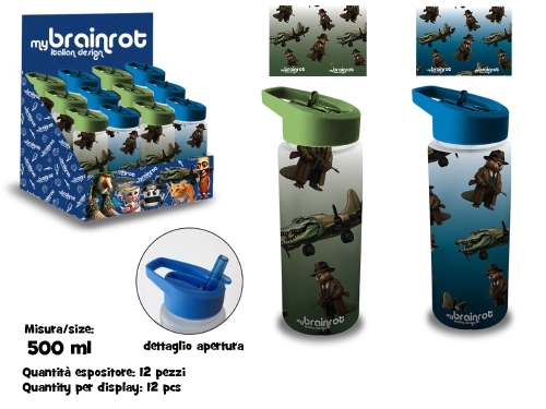 Borraccia trasparente da 500 ml con effetto matt e design BRAINROT, ideale per scuola e sport.