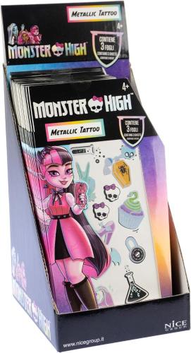 CONTENUTO: Blister con 3 fogli di tatuaggi metallizzati con soggetti di Monster High. Età consigliata: 6 +