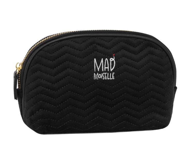 Pochette con stampa "Mad Moiselle" posta frontalmente e chiusura con zip