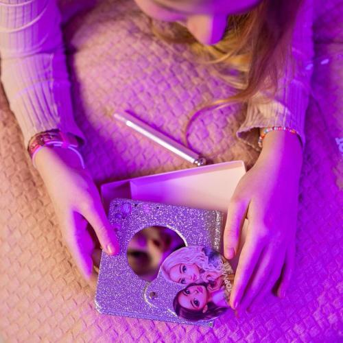 Include una biro argentata con cappuccio rosa e uno specchio nascosto.
