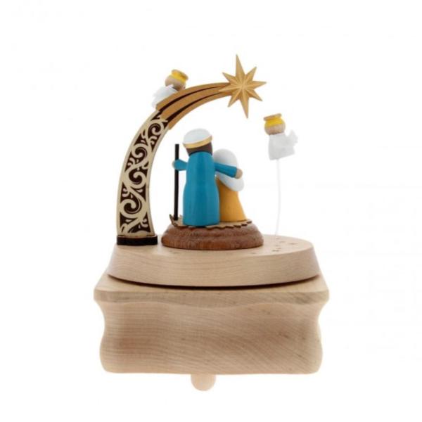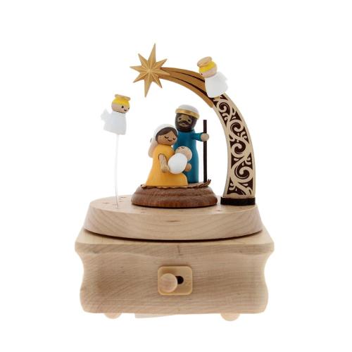 La scena, ricca di piccoli dettagli come gli animali, le decorazioni della stalla e le espressioni serene dei personaggi, prende vita quando si aziona il meccanismo musicale: la piattaforma ruota lentamente accompagnata da una melodia dolce e armoniosa, creando un’atmosfera poetica e suggestiva.