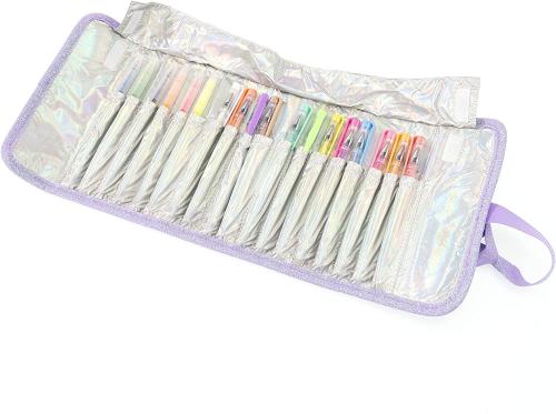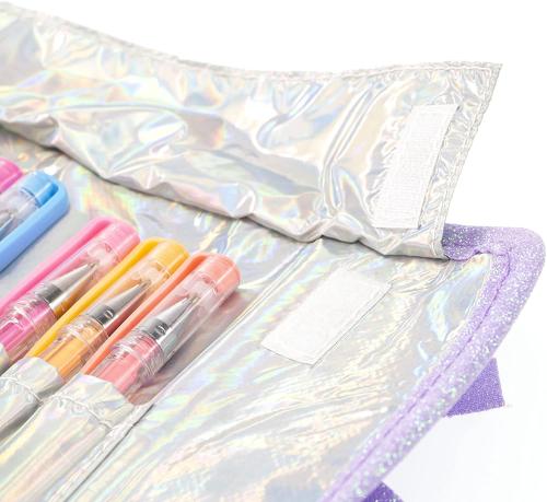 CARATTERISTICHE: l’astuccio arrotolabile è chiuso da un morbido nastro in tessuto glitterato. L’interno è rivestito in tessuto morbido dai colori cangianti e contiene 12 penne gel e 6 pennarelli di colori assortiti.
