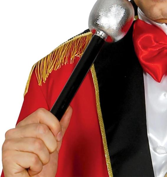Costume in poliestere composto da giacca modello frac con bordi oro e frange, pantaloni con elastico in vita, pettorina effetto camicia e gilet con papillon. Cilindro, baffi e microfono acquistabli separatamente. TAGLIA M: Giacca: larghezza spalla cm 48, circonferenza torace cm 112, lunghezza avanti cm 54, lunghezza dietro cm 104, lunghezza pettorina cm 72 circa. Pantaloni: circonferenza vita cm 88/104, circonferenza bacino cm 130, lunghezza cm 105. TAGLIAL: Giacca: larghezza spalla cm 51, circonferenza torace cm 120, lunghezza avanti cm 54, lunghezza dietro cm 108, lunghezza pettorina cm 72 circa. Pantaloni: circonferenza vita cm 90/112, circonferenza bacino cm 136, lunghezza cm 110.