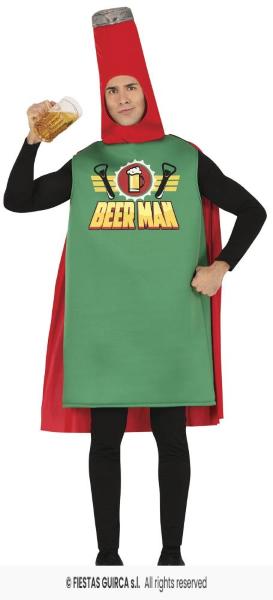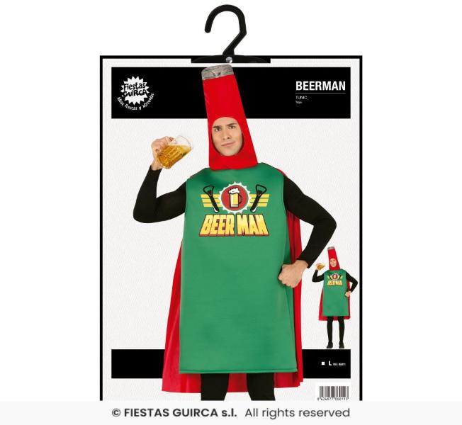 CONTENUTO di questo costume da uomo in maschera da birraio: tunica a forma di bottiglia, mantello. NON_INCLUSO: camicia nera, pantaloni neri, boccale di birra