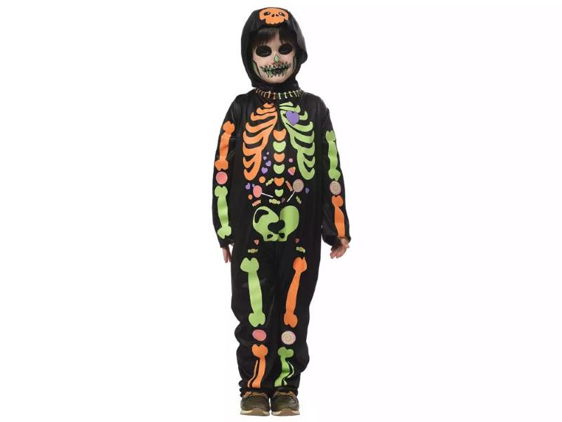 Include: 1 costume da scheletro con tuta a maniche lunghe in nero con ossa e caramelle colorate e cappello coordinato.