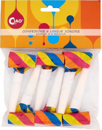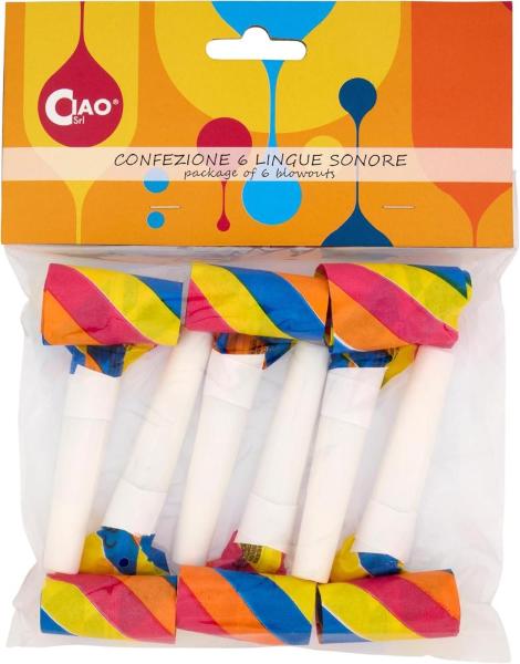 La confezione contiene 6 lingue fantasia con cavallotto, decorate con fantasie vivaci e colori brillanti. Soffiando, la lingua si srotola creando un simpatico effetto sonoro e visivo, perfetto per compleanni, feste a tema, Carnevale e animazione.
