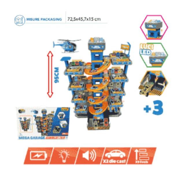 Garage elettronico a 9 piani con luci e suoni realistici! Include 2 veicoli in metallo per un'esperienza di gioco dinamica. Dotato di rampe, ascensore funzionante e aree di sosta, stimola la creatività e il divertimento. 3 batterie 1,5 "AA" (Non incluse)